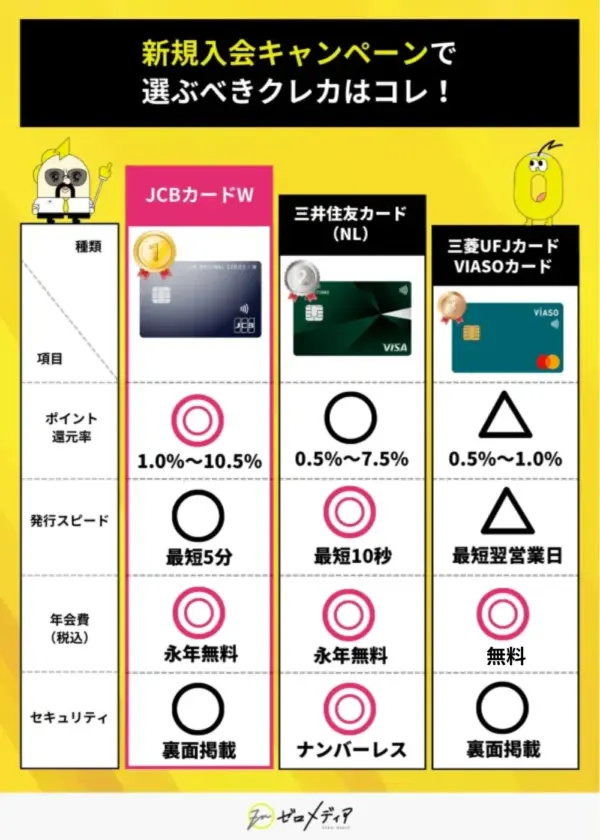 キャンペーンがお得なクレジットカード | JCBカードW | 三井住友カード(NL) | 三菱UFJカード VIASOカード |