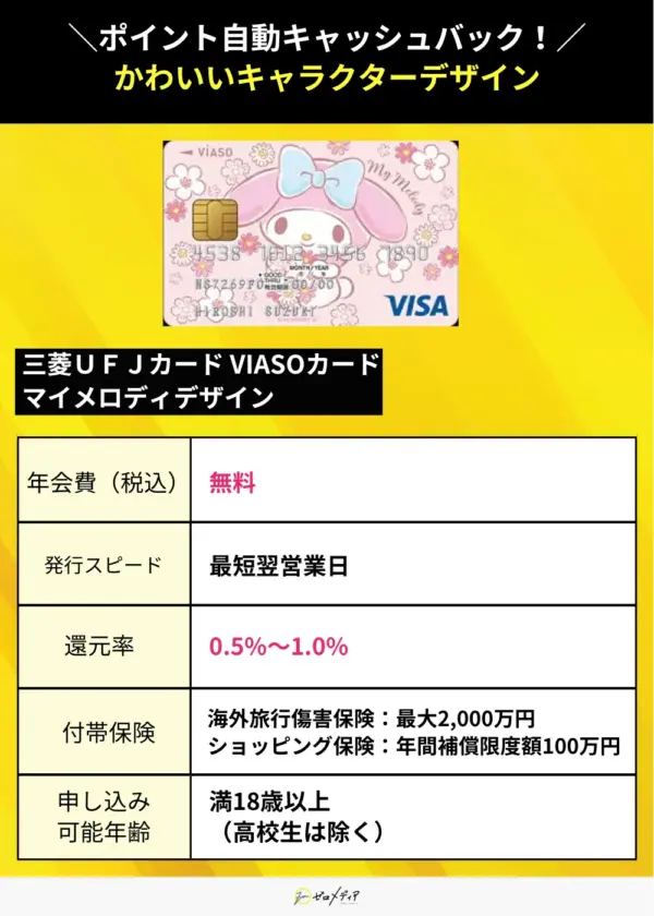 年会費無料のクレジットカードでかわいいのは、三菱UFJカード VIASOカード(マイメロデザイン)です。