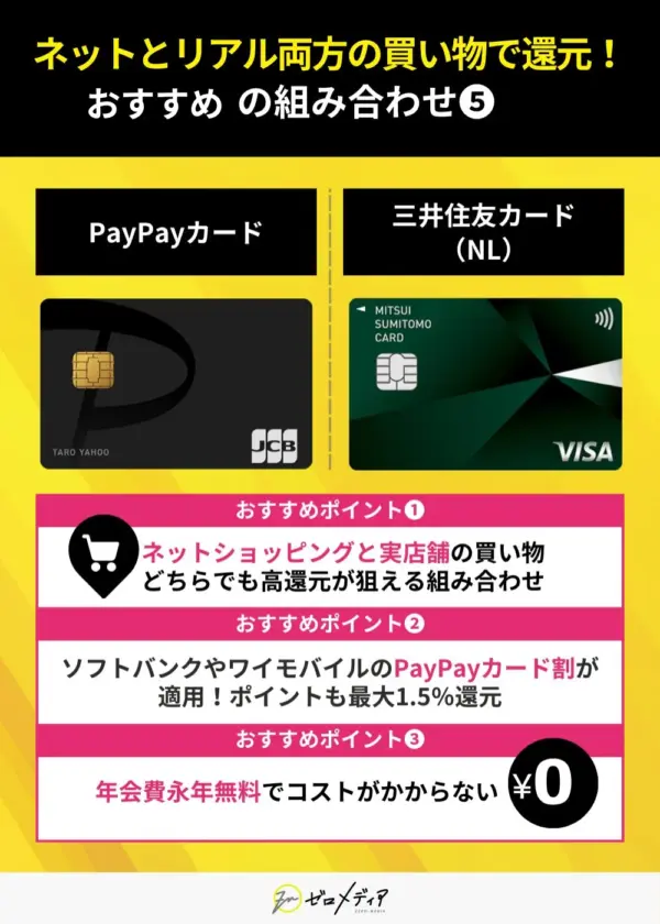また、自分がよく使う店舗やサービスで還元率がアップする2枚を選べば、手軽にポイントを貯められる最強候補の組み合わせができるでしょう。