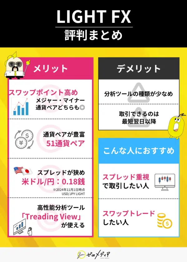 LIGHT FXは業界最狭水準のスプレッドや多様な取引ツールの提供、充実した顧客サポート、そして高いセキュリティと信託保全という特徴をもっており、トレーダーからの人気が高いです。