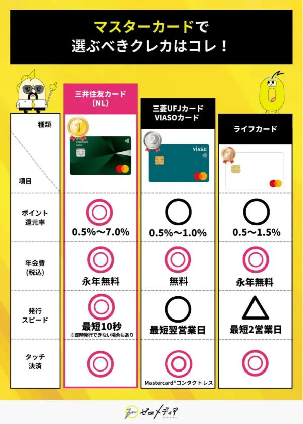 マスターカードブランドの中でおすすめは、三井住友カード(NL)です。年会費無料で最大還元率7%、さらにナンバーレスなので安心して利用できます。