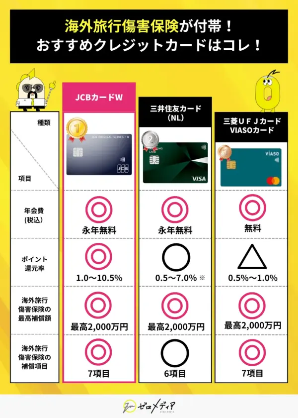 「ポイント還元率」「旅行付帯保険の内容」「年会費の安さ」「専門家インタビュー」「ユーザーアンケート」にて検証を行った結果、当メディアが総合的に最もおすすめする海外旅行保険付きクレジットカードは『JCBカードW』です。